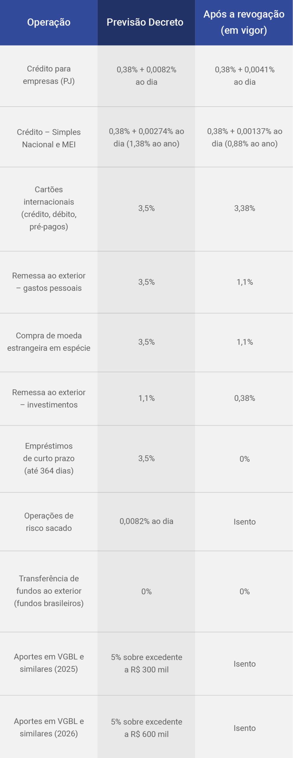 Confira, a seguir, o comparativo entre as alíquotas previstas no decreto e os percentuais que voltam a valer após a revogação.